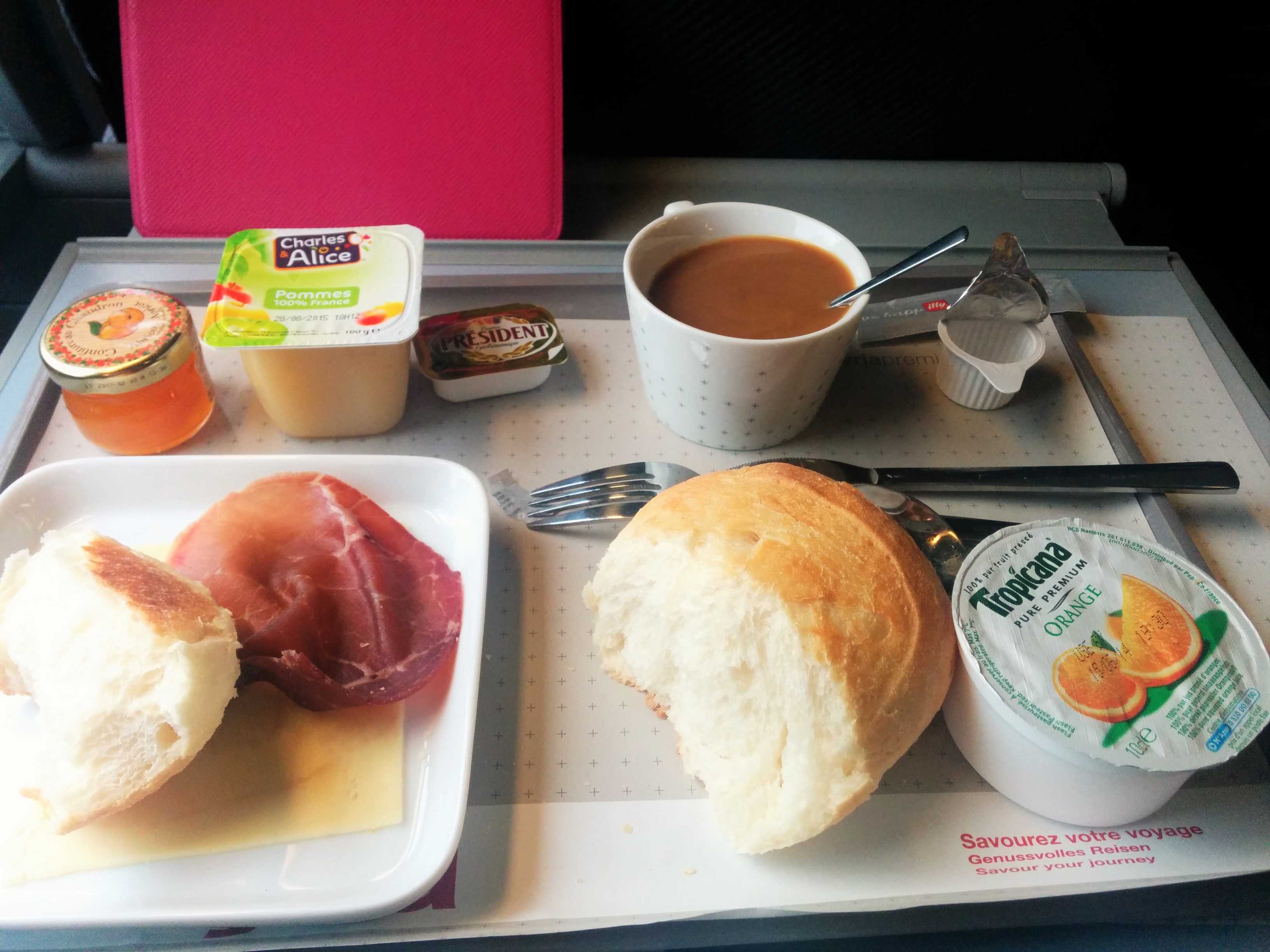 allows little possibility for taking photos of the scenery properly, but still I tried, making it clear to the others on the train around me that I was obviously a tourist. When I got tired of that I took a photo of the very sophisticated breakfast meal they served me (I was given a choice between the sweet or the salty breakfast, and this is what I got. Can you guess what I chose?)